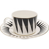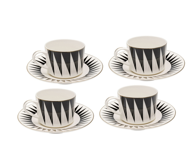 KARE komplet 4 filiżanek HARLEQUIN. Elegancka propozycja wykonana z porcelany, która zachwyca geometrycznym wzorem w kontrastujących odcieniach czerni i bieli. Każdy egzemplarz jest ręcznie robiony, co sprawia, że każda filiżanka jest niepowtarzalna i wyjątkowa. Złote wykończenia na krawędziach dodają luksusowego charakteru, idealnie komponując się z wyrazistym designem. Harlequin zapewnia komfortowe użytkowanie przy codziennych chwilach relaksu z ulubioną kawą. Ze względu na ręczne wykonanie i delikatne materiały, filiżanka nie nadaje się do mikrofalówki ani do mycia w zmywarce. Zestaw zawiera 4 sztuki produktu. Wymiary 1 szt: wys. 5,9 cm / szer. 16 cm / gł. 8,9 cm Pojemność: 220 ml Waga netto: 0,33 kg.