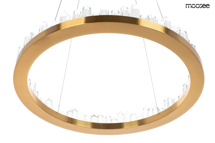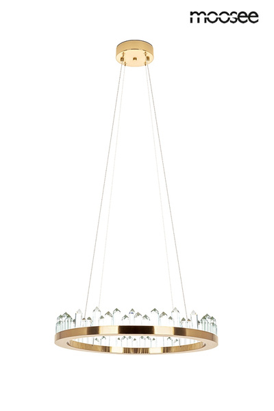 Okrągły kształt lampy, połączenie złota i kryształów zapewniają wyjątkowe oświetlenie pomieszczenia.