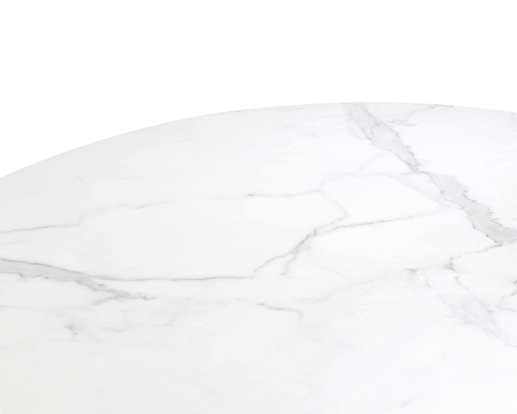 Okrągły blat wykonany z konglomeratu imitującego marmur zachwyca subtelnym rysunkiem kamienia i nadaje wnętrzu ponadczasowy charakter.