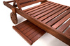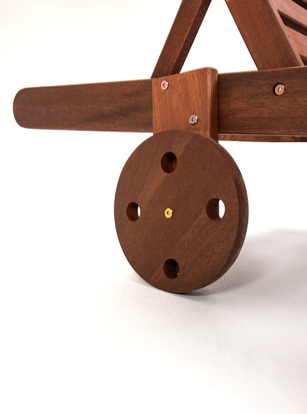 Wygodny leżak z możliwością regulacji oparcia i wbudowanymi kółkami wykonano z wysokiej jakości drewna.