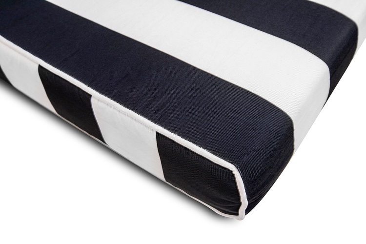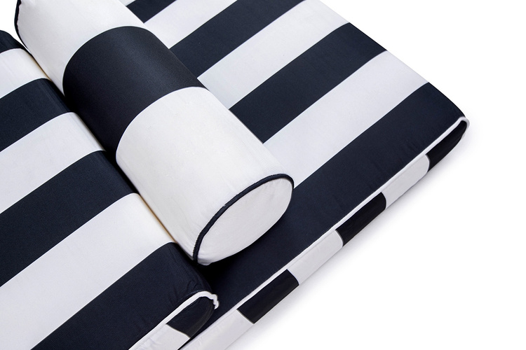 Biało-czarny materac wykończono z tkaniny outdoorowej, która jest odporna na warunki atmosferyczne.