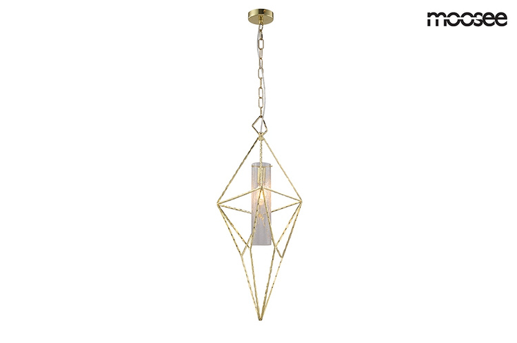 Całość została umieszczona na złotej podsufitce, eleganckim łańcuszku i transparentnym przewodzie.