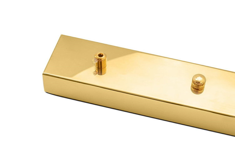 Podsufitka prostokątna złota. Wykonana jest ze stali w błyszczącym złotym kolorze, co nadaje jej szykowny i nowoczesny wygląd. Dzięki prostemu kształtowi i eleganckiemu wykończeniu doskonale będzie pasować do współczesnych, minimalistycznych wnętrz. Idealnie sprawdzi się na dwie lampy. Dostępna także srebrna wersja. Wymiary: wys. 3,5 cm / szer. 44 cm / gł. 5,5 cm Odległość między mocowaniami na kabel: 34 cm.