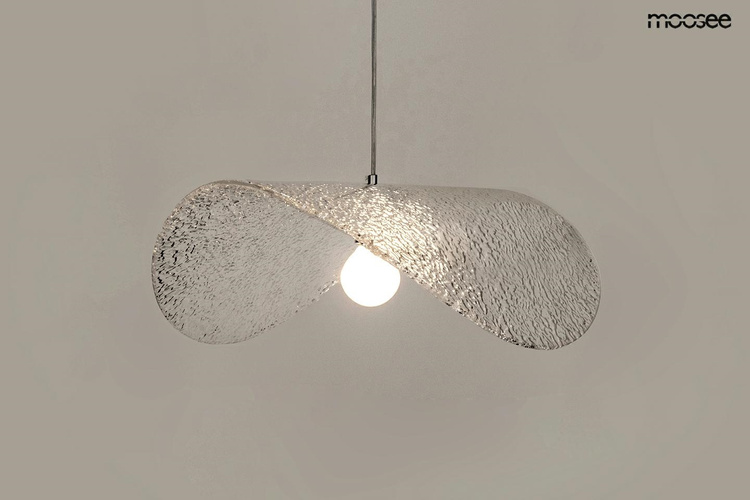 MOOSEE Lampa wisząca CAPELLO FI 60 clear. Wyjątkowa oprawa, która zachwyca swoim pięknym, strukturalnym szklanym kloszem przypominającym kapelusz. Wewnątrz klosza ukryte jest źródło światła, które delikatnie rozprasza się przez szkło, tworząc przytulną i elegancką atmosferę. To niezwykła propozycja, która łączy w sobie subtelność i oryginalny design, idealnie pasując do nowoczesnych wnętrz. Lampa Capello jest dostępna w różnych rozmiarach, co pozwala dopasować ją do różnorodnych aranżacji i przestrzeni. Światło: 1 x E27 max. 40 W / 220 V (brak w zestawie) Oprawa: wys. 215 cm / szer. 60 cm / gł. 50 cm Klosz: wys. 20 cm / szer. 60 cm / gł. 50 cm Podsufitka: wys. 2,5 cm / śr. 10 cm Przewód: 200 cm Wymiary opakowania: 67 cm / 59 cm /28 cm Waga netto: 2,7 kg.