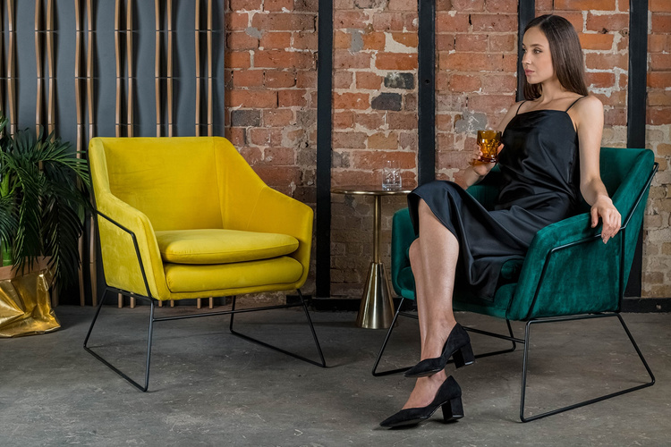 Siedzisko oraz poduszka tapicerowane aksamitnym welurem wprowadzają do wnętrza ciepło i energię.