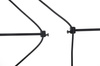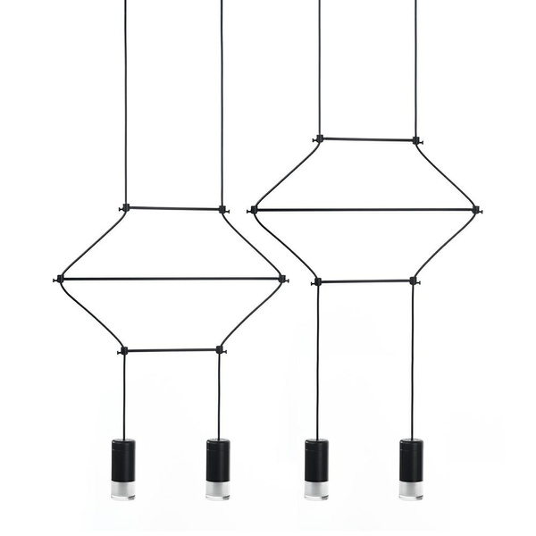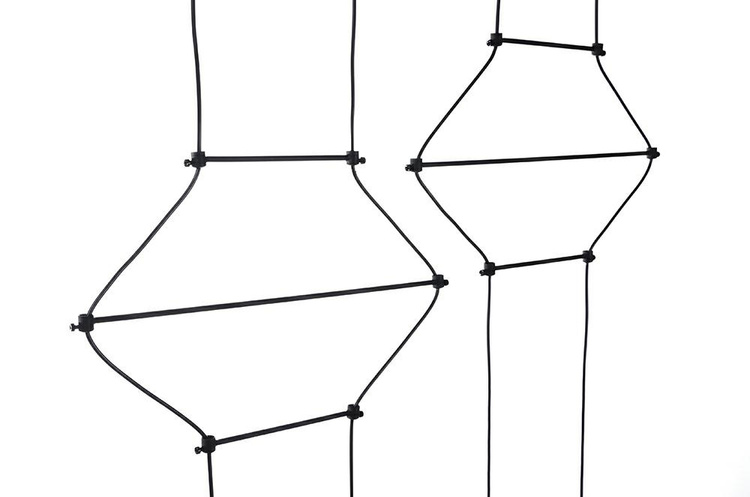 Kształt lampie nadają metalowe elementy, które wraz z przewodami tworzą geometryczną konstrukcję w czarnym kolorze.