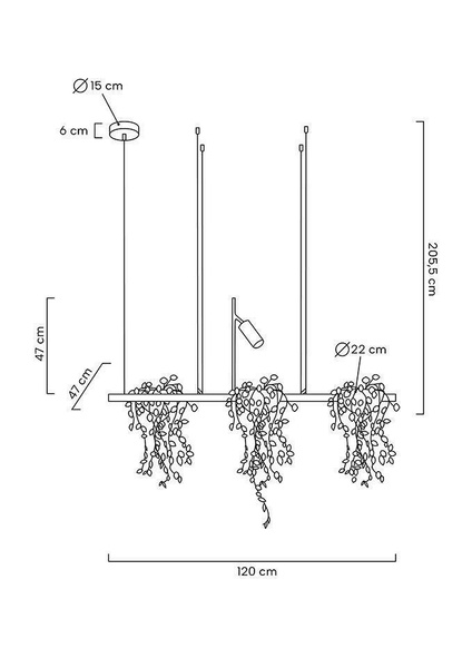 Na stelażu znajdują się trzy donice na rośliny, dzięki którym lampa posłuży również jako kwietnik.