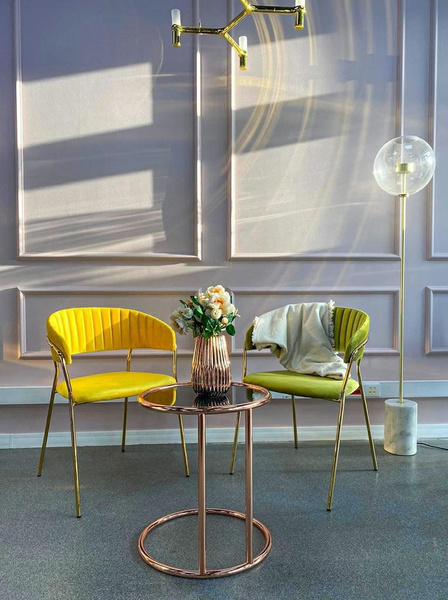 Stabilna podstawa w połyskującym, złotym kolorze nadaje elegancki, luksusowy charakter i tworzy harmonijne zestawienie z głębokim, żółtym odcieniem tapicerki.