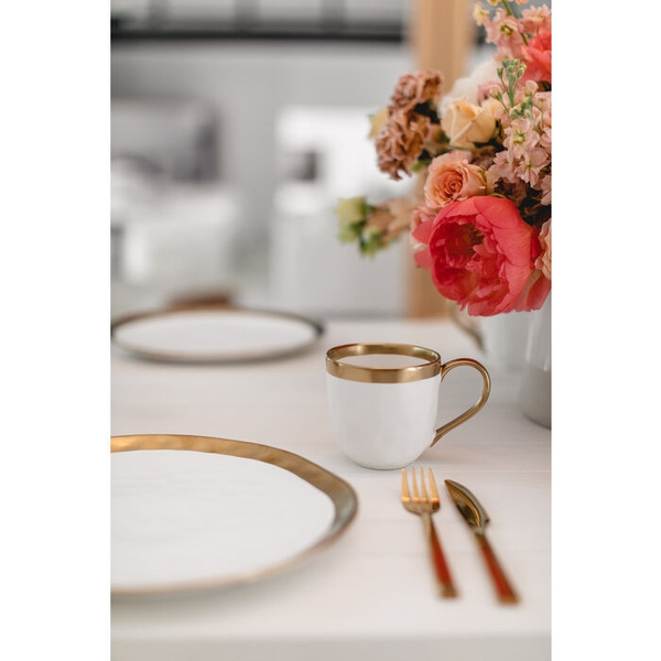 Szykowny, nowoczesny kształt z luksusowo biało-złotym wykończeniem to doskonały sposób na celebrowanie codziennych posiłków.