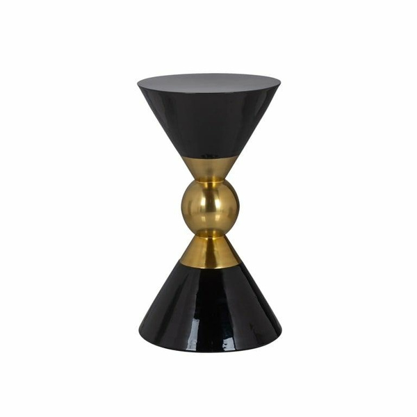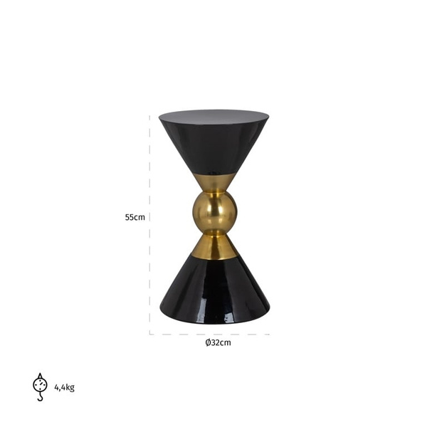 RICHMOND stolik ROWY 32 czarno-złoty. Stolik Rowy marki Richmond Interiors ma designerski, a zarazem luksusowy wygląd. Charakteryzuje go kształt klepsydry z okrągłą złotą kulą pośrodku. Wykonany jest w całości z metalu oraz aluminium w czarno-złotej kolorystyce. Rowy można również ciekawie skomponować z innymi stolikami. Wymiary: wys. 55 cm / szer. 32 cm / gł. 32 cm Blat: śr. 32 cm Waga netto: 4,4 kg.