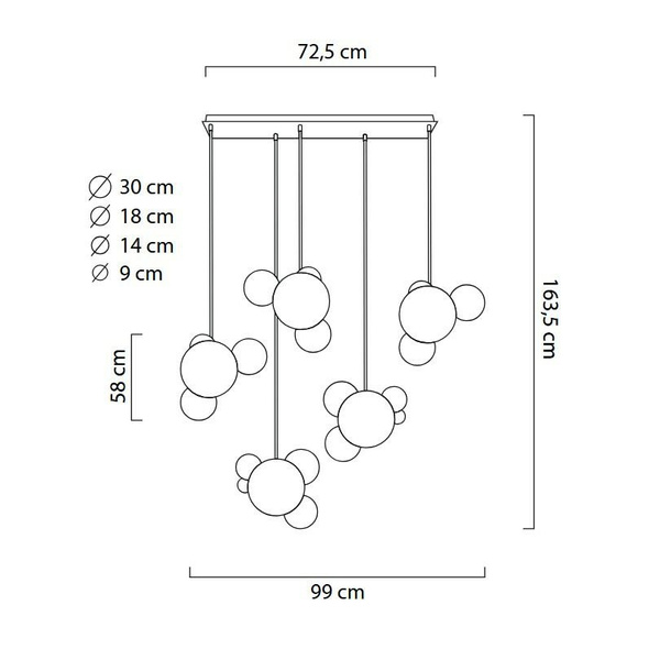 MOOSEE lampa Capri line 5 składa się z kulistych, szklanych kloszy oraz anodowanego aluminium. Pięć głównych kul zawieszonych zostało na przewodach, wychodzących z jednej podsufitki. Wewnątrz każdej z kul jest złoty pręt zakończony źródłem światła LED. Do głównych kloszy doczepione są pozostałe kule za pomocą mocowań w kolorze złotym. Całość przypomina połączone bańki mydlane. Snop światła skierowany jest zarówno do dołu oraz do góry. Światło: moduł LED 10 x 7 W (wbudowany) / 5600 lm / 3000 K (możliwość odpłatnej zmiany na 4000 K) Oprawa: wys. 99 cm / szer. 163,5 cm / gł. 72 cm Klosz: 5 x 30 cm / 5 x 18 cm / 5 x 14 cm Mocowanie: szer. 125 cm / wys. 8 cm Montaż: instalacja sufitowa Waga netto: 17 kg Sposób wysyłki: paleta.