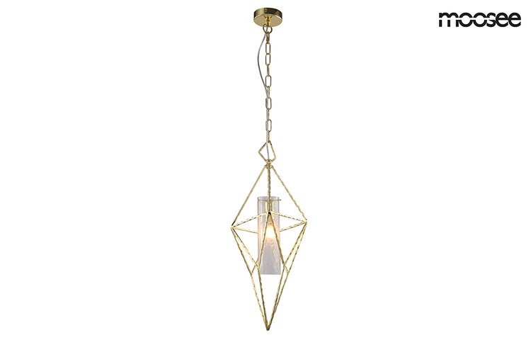 Lampa wisząca HAVANA M od marki MOOSEE. Geometryczną konstrukcję wykonano z połączenia metalu w kolorze złotym i szklanego klosza. Klosz otoczony jest geometrycznym stelażem. Całość została umieszczona na złotej podsufitce, eleganckim łańcuszku i transparentnym przewodzie. Lampy z kolekcji Havana tworzą elegancką kompozycję, która z powodzeniem rozświetli wnętrze salonu, kuchni lub hotelowego lobby. Światło: E14 max. 40 W (brak w zestawie) Oprawa: wys. 272 cm / szer. 19 cm / gł. 19 cm Klosz: wys. 60 cm / szer. 19 cm Mocowanie: szer: 10 cm / wys. 2,5 cm Montaż: instalacja sufitowa Waga netto: 3 kg Wymiary opakowania: 72,5 cm / 41,5 cm / 28 cm.