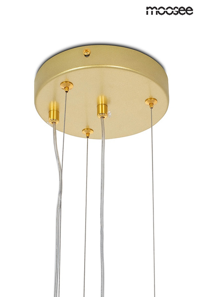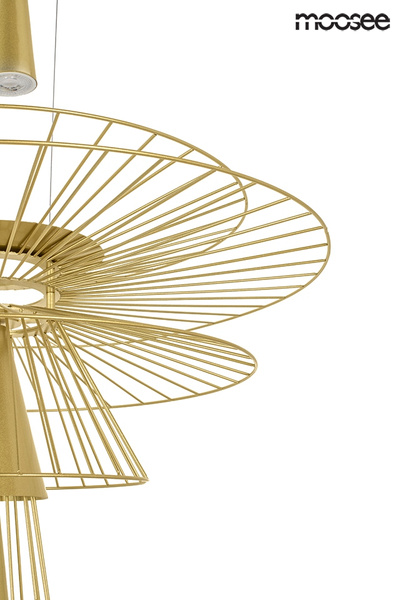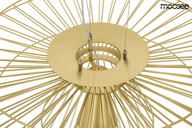 MOOSEE lampa wisząca SESTO złota. Eleganckie i unikatowe wzornictwo idealnie wpisuje się w styl glamour. Kompozycja metalowych drutów ułożona kaskadowo z zastosowaniem dwóch źródeł światła skierowanych w dół. Oświetlenie górnego klosza odbija się od płaskiego okręgu w środku oprawy, który rozprasza strumień światła. Nowoczesny i stylowy wygląd lampy uczyni każde wnętrze wyjątkowym. Światło: 2 x GU10 max. 5 W (brak w zestawie) Oprawa: wys. 250 cm / szer. 60 cm / gł. 60 cm Klosz: wys. 48 cm / szer. 60 cm / gł. 60 cm Mocowanie: wys. 3 cm / śr. 15 cm Przewód: 200 cm Montaż: instalacja sufitowa Waga netto: 4 kg Wymiary opakowania: 90 cm / 65 cm / 20 cm.