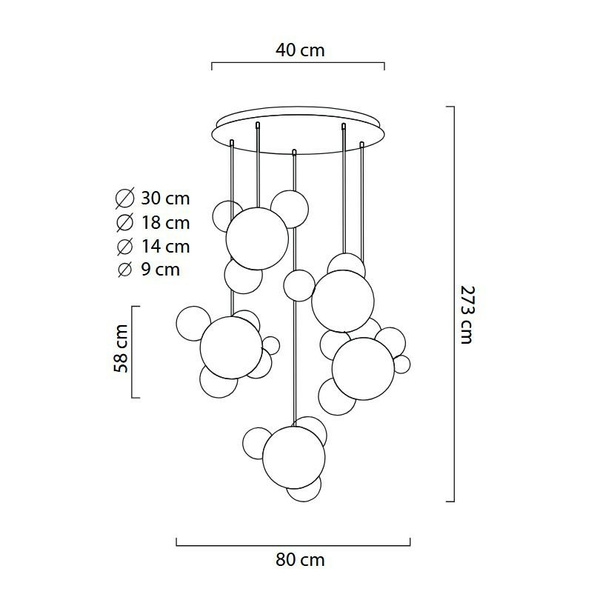 Pięć głównych kul zawieszonych zostało na przewodach, wychodzących z jednej podsufitki. Wewnątrz każdej z kul jest złoty,