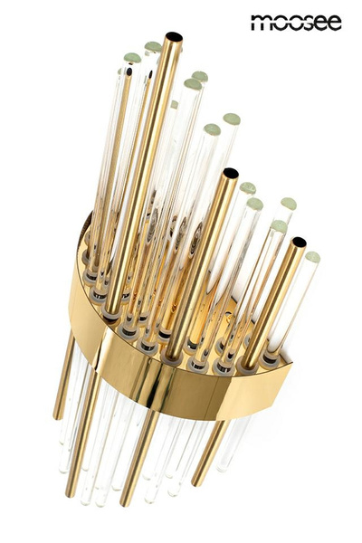 Snop światła przebija się przez transparentne elementy, a zatrzymuje na złotych rurkach, co tworzy niezwykły efekt wizualny.
