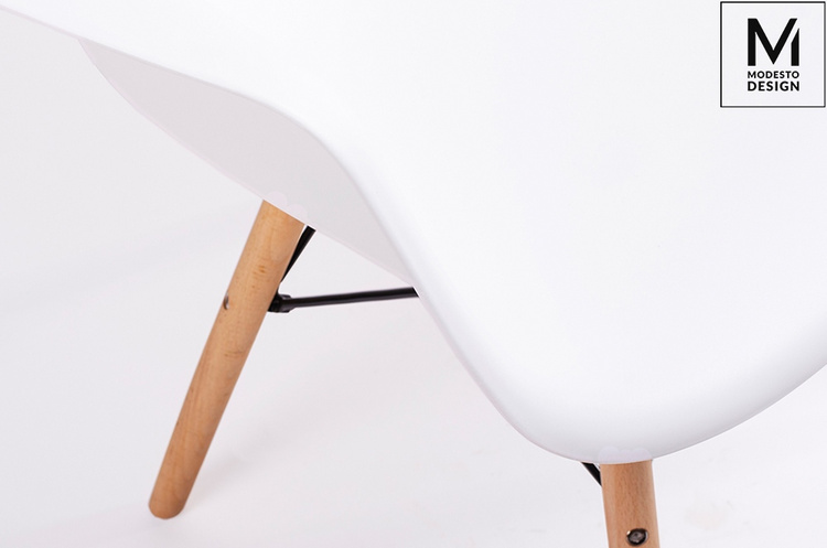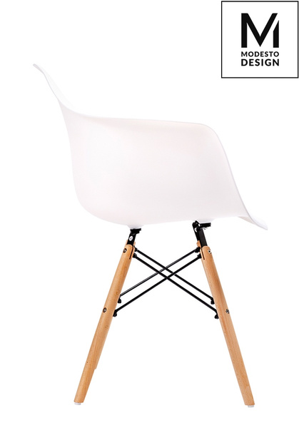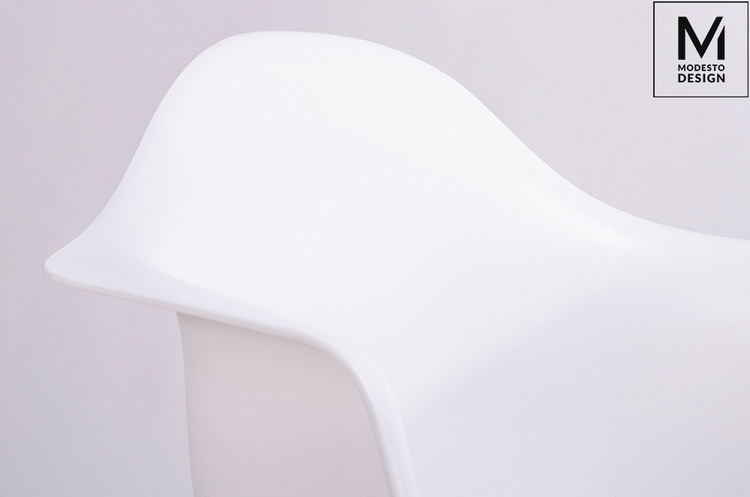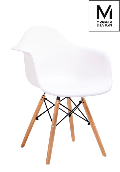 Fotel DAW DSW marki MODESTO DESIGN. Siedzisko w całości zostało wykonane z polipropylenu w kolorze białym matowy. Łączenia ze stali w kolorze czarnym. Nogi z drewna bukowego. Wygodny fotel który, dzięki zaostosowaniu tworzywa sztucznego jest łatwy w czyszczeniu. Doskonale sprawdzi się w jadalni. Wymiary: wys. 79 cm / szer. 62 cm / gł. 62 cm Wysokość do krawędzi siedziska: 45 cm Waga netto: 7 kg Wymiary opakowania: 61 cm / 60 cm / 81 cm.