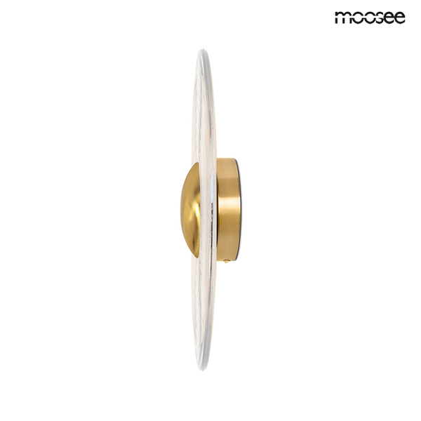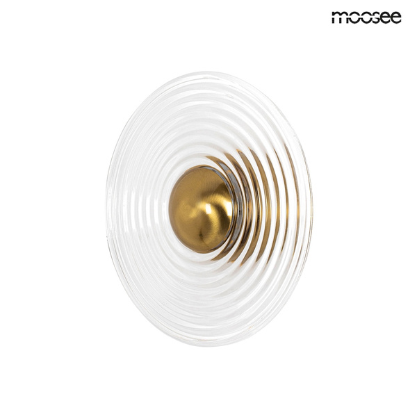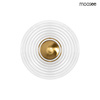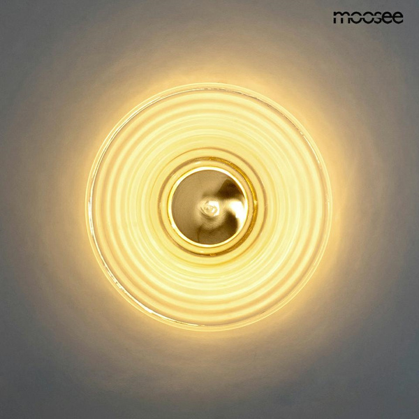 Szklany klosz w hipnotyzujący sposób rozprasza światło, a okrągły metalowy element w kolorze złotym pełni funkcję dekoracji.