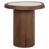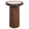 RICHMOND stolik MELROSE brązowy. Elegancki stolik o nowoczesnym charakterze, który przyciąga uwagę swoim wyrafinowanym designem. Blat wykonany jest z wysokiej jakości włoskiego marmuru Botticino, którego delikatne żyłkowanie w ciepłych tonacjach nadaje całości subtelnej elegancji. Obramowanie i podstawa stolika zostały stworzone z drewna mango w głębokim, brązowym odcieniu, dodając naturalnego uroku i solidności. Zaokrąglony kształt oraz masywna, cylindryczna noga podkreślają nowoczesną estetykę i stabilność konstrukcji. To propozycja dla osób ceniących wysokiej klasy materiały i ponadczasowy styl. Wymiary: wys. 51 cm / szer. 39 cm / gł. 50 cm Waga netto: 10,9 kg.
