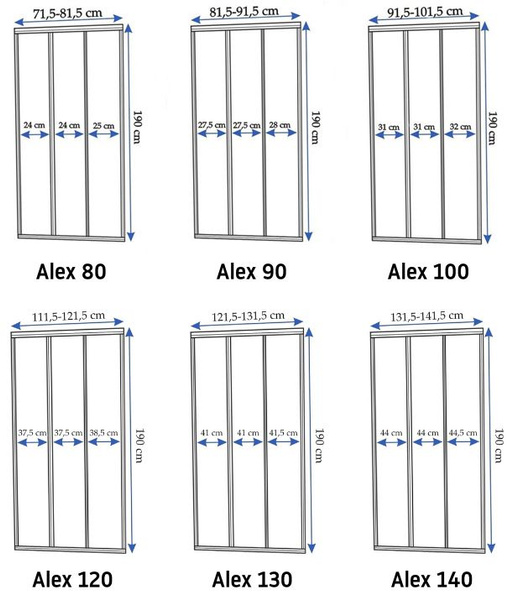 Drzwi Alex składają się z jednego elementu nieruchomego oraz dwóch elementów przesuwnych.