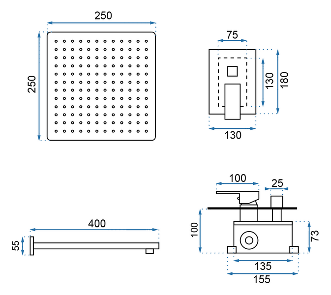 W komplecie znajduje się Ultra Cienka 2mm deszczownica kwadratowa 25 cm, bateria z elementami natynkowymi oraz podtynkowymi, wąż ze słuchawką oraz zestawem punktowym.