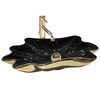 Umywalka wykonana z najwyższej jakości ceramiki w czarnym kolorze i owalnym, pofalowanym kształcie. Umywalka wykończona złotym rantem, co nadaje piękny efekt końcowy. Umywalka jest niesamowicie atrakcyjna dla oka, jest idealna dla miłośników niestandardowych kształtów, wnosząc elegancję do aranżacji łazienki w domu i biurze.
