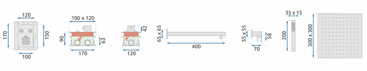 W komplecie znajduje się kwadratowa deszczownica slim o boku 30 cm, bateria z elementami natynkowymi oraz podtynkowymi, wąż ze słuchawką oraz zestawem punktowym.