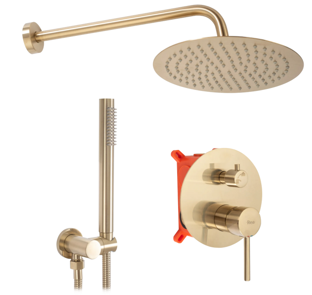Prezentujemy Państwu nowy model zestawu podtynkowego z serii Lungo. Ze względu na uniwersalność i niesamowite walory estetyczne, zestaw jest doskonałym wyborem dla właścicieli każdej łazienek. Modny kształt elementów nad tynkowych został pokryty najwyższej jakości złotą, szczotkowaną powłoką. Dzięki tej technice bateria jest chroniona przed korozją i odbarwieniami. W komplecie znajduje się ultra cienka okrągła deszczownica, bateria z elementami natynkowymi oraz podtynkowymi, wąż ze słuchawką oraz zestawem punktowym. Zestaw Lungo jest idealny dla osób, którę szukają nietuzinkowych rozwiązań i chcą stworzyć oryginalną i niepowtarzalną łazienkę swoich marzeń.
