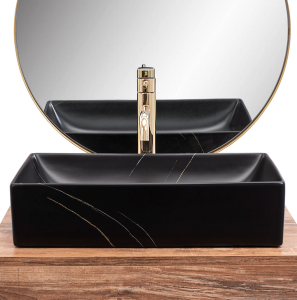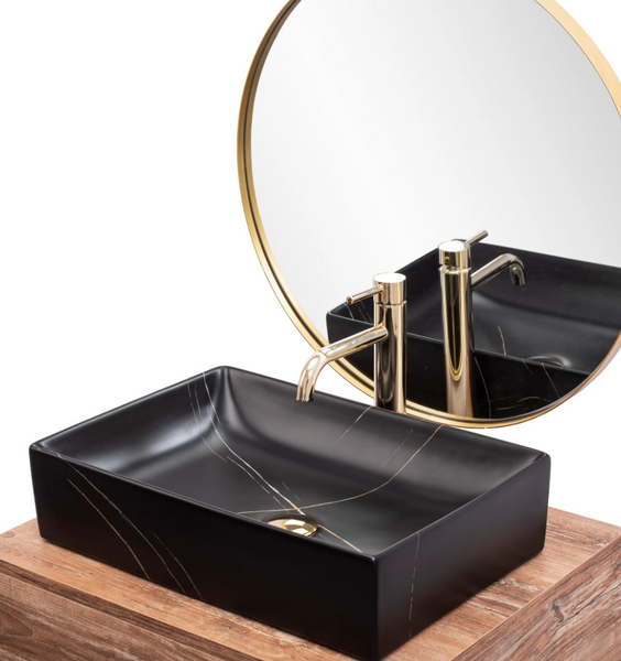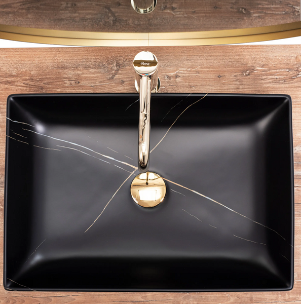 Piękna i niezwykle funkcjonalna umywalka Inga w kolorze czarnym ze złotym żyłami imitującymi naturalny kamień. Każdy egzemplarz posiada niepowtarzalny i unikalny wzór. Jest to produkt, który w doskonały sposób wypełni Państwa przestrzeń łazienkową zachowując nienaganny wygląd i estetykę wnętrza. Umywalka jest przystosowana do montażu na blacie bądź szafce. Dzięki specjalnej fazie produkcji jest trwała i łatwa w utrzymaniu czystości. Najwyższa jakość ceramiki sanitarnej o matowym czarnym wykończeniu zwróci uwagę każdego.