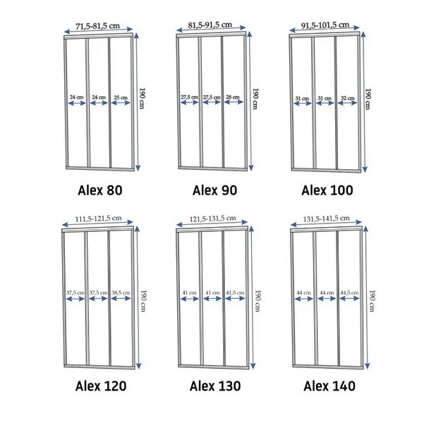 Drzwi Alex składają się z jednego elementu nieruchomego oraz dwóch elementów przesuwnych.