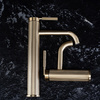 Elegancka bateria umywalkowa Agron w złotym szczotkowanym wykończeniu wyróżnia się nowoczesnym, minimalistycznym designem z subtelnymi ryflowaniami na korpusie, co dodaje jej wyjątkowego charakteru. Wykonana z wysokiej jakości mosiądzu, zapewnia trwałość i odporność na korozję, gwarantując długotrwałe użytkowanie.