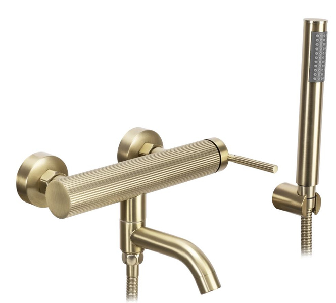 Prezentujemy Państwu piękną, niezwykle funkcjonalną i nowoczesną baterię wannową z ruchomą, składaną wylewką. Oryginalny, ryflowany korpus, nadaje jej nowoczesny, a zarazem elegancki wygląd. Bateria jest przystosowana do montażu ściennego. Została wykonana z mosiądzu pokrytego potrójną złotą matową warstwą. Dzięki specjalnej fazie produkcji jest trwała i łatwa w utrzymaniu czystości.