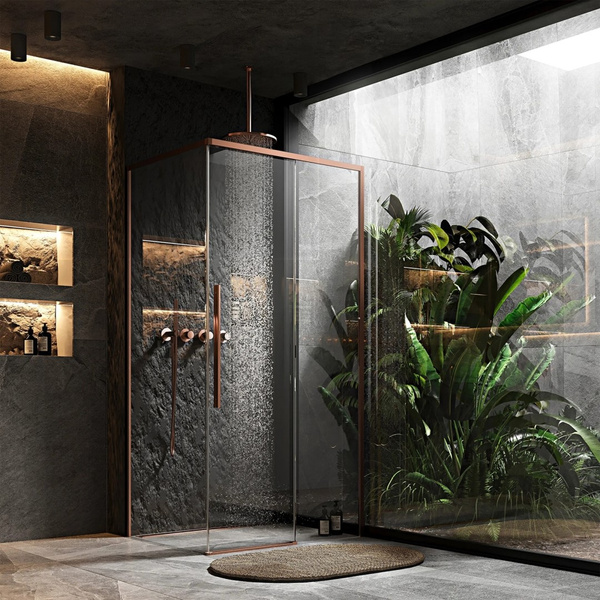 Solar to wyrazista, a zarazem ponadczasowa i nowoczesna kabina prysznicowa, która została wykonana z najwyżej jakości materiałów i wykończona w pięknym miedzianym kolorze. Piękne, szczotkowane pokrycie jest odporne na zabrudzenia i plamy, a dodatkowo jest łatwe w utrzymaniu czystości. Połączenie miedzianych profili, długiego uchwytu oraz zawiasów wraz z przezroczystą linią szklanych powierzchni, doskonale wkomponuje się w nowoczesną oraz tradycyjną łazienkę.