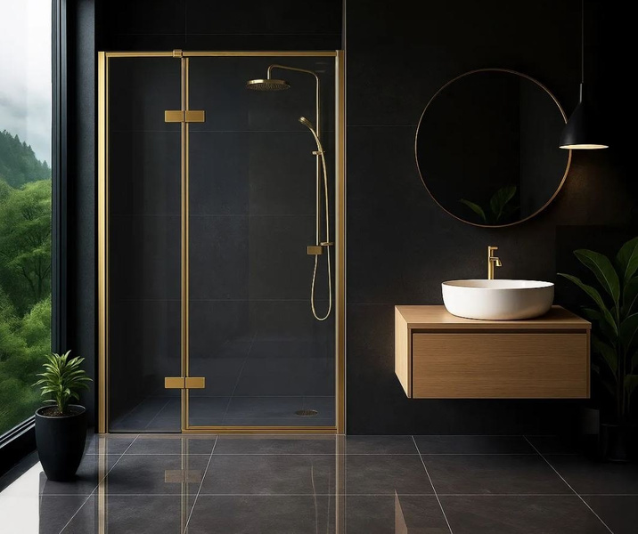 Konstrukcję drzwi uzupełniają aluminiowe profile w kolorze złotym szczotkowanym. Wykończenie to nadaje wnętrzu wyjątkowy charakter i doskonale komponuje się z elementami armatury w ciepłych, luksusowych odcieniach. Profile wykonano z wysokogatunkowego aluminium, które charakteryzuje się odpornością na wilgoć i korozję, co gwarantuje trwałość całej konstrukcji.