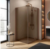 Kabina prysznicowa Hugo narożna to eleganckie i praktyczne rozwiązanie stworzone z myślą o nowoczesnych łazienkach. Składa się z drzwi otwieranych na zawiasach oraz bocznej ścianki stałej. Hartowane, przydymione szkło w odcieniu brązowym połączone z profilami wykonanymi z wytrzymałego aluminium w kolorze miedzi szczotkowanej tworzy efektowną i trwałą całość.