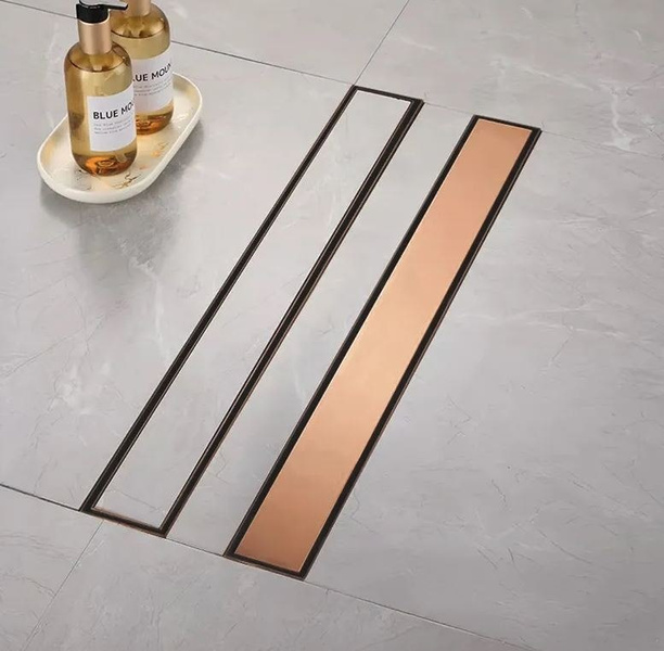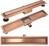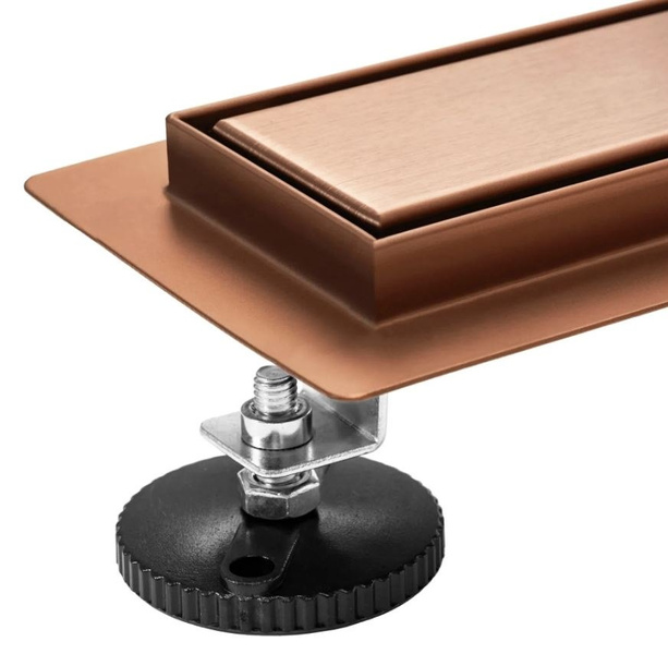 Maskownica w odpływie jest obustronna – z jednej strony miedź szczotkowana, a z drugiej przystosowana do wklejenia płytki, co pozwala na idealne dopasowanie do aranżacji wnętrza. Dzięki takiemu rozwiązaniu odpływ pozostaje dyskretny, a cała strefa prysznicowa nabiera minimalistycznego i eleganckiego charakteru.