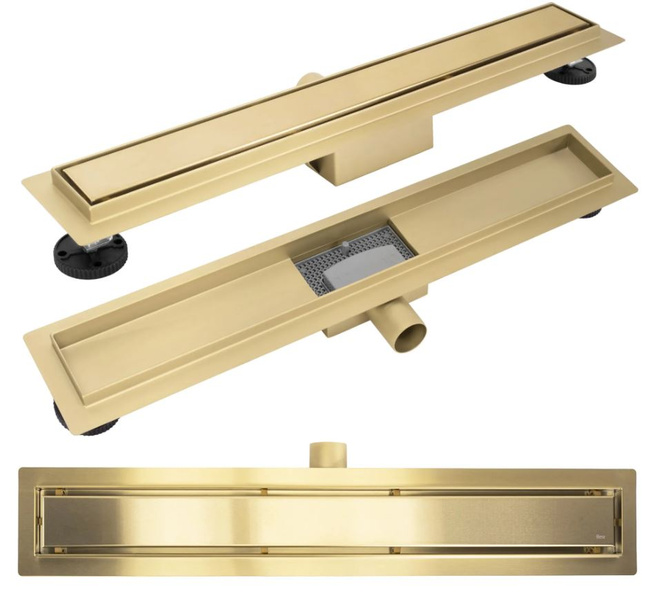 Maskownica w odpływie jest obustronna – z jednej strony złota szczotkowana, a z drugiej przystosowana do wklejenia płytki, co pozwala na idealne dopasowanie do aranżacji wnętrza. Dzięki takiemu rozwiązaniu odpływ pozostaje dyskretny, a cała strefa prysznicowa nabiera minimalistycznego i eleganckiego charakteru.