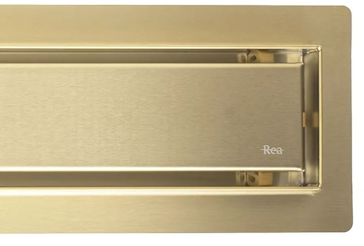 Maskownica w odpływie jest obustronna – z jednej strony złota szczotkowana, a z drugiej przystosowana do wklejenia płytki, co pozwala na idealne dopasowanie do aranżacji wnętrza. Dzięki takiemu rozwiązaniu odpływ pozostaje dyskretny, a cała strefa prysznicowa nabiera minimalistycznego i eleganckiego charakteru.