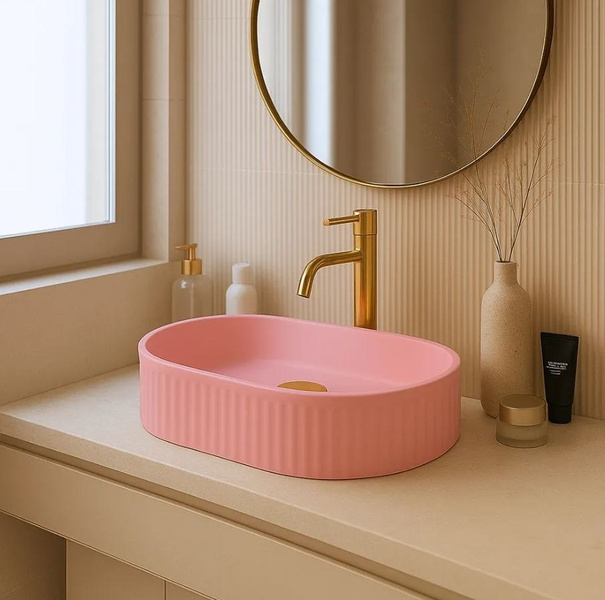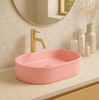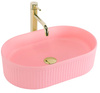 Umywalka nablatowa w kolorze różowym Bubble Gum Matt to stylowe rozwiązanie, które nada łazience nowoczesny charakter i podkreśli jej wyjątkowy wystrój. Matowa powierzchnia w pastelowym odcieniu różu sprawia, że model wyróżnia się subtelną elegancją i doskonale wpisuje się w aktualne trendy aranżacyjne. Wykonana z wysokiej jakości ceramiki sanitarnej, umywalka łazienkowa jest odporna na codzienne użytkowanie i łatwa w utrzymaniu czystości. Jej ryflowana powierzchnia zewnętrzna tworzy efektowną dekorację, która łączy funkcjonalność z niepowtarzalnym designem, czyniąc z niej idealny wybór do nowoczesnych łazienek.
